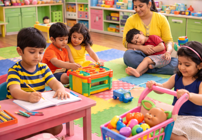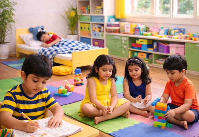 Our hourly daycare service is designed for parents who need short-term childcare support. Whether you have a meeting, appointment, event, or urgent work, you can leave your child with complete peace of mind.Children are engaged in safe and supervised activities during their stay, including storytelling, drawing, free play, and interactive games.